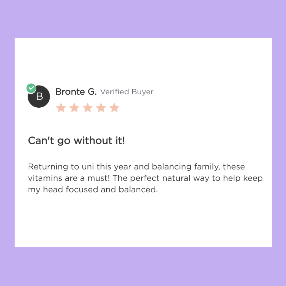 "Can't go without it! Returning to uni this year and balancing family, these vitamins are a must! The perfect natural way to keep my head focused and balanced."