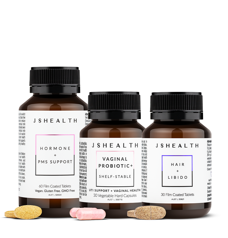 Designed to support your female needs, this kit features Hormone + PMS Support, Vaginal Probiotic+ and Hair + Libido.