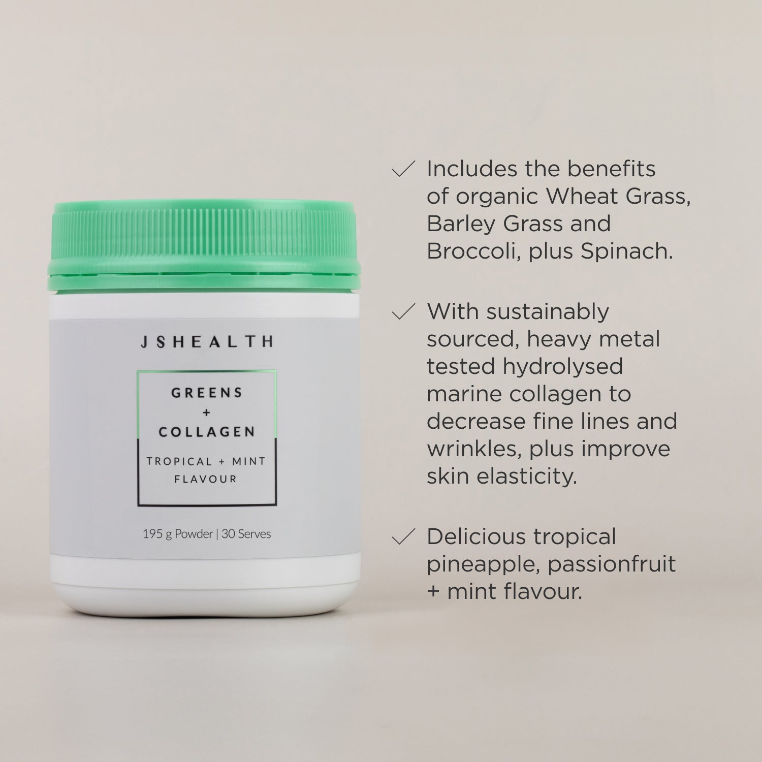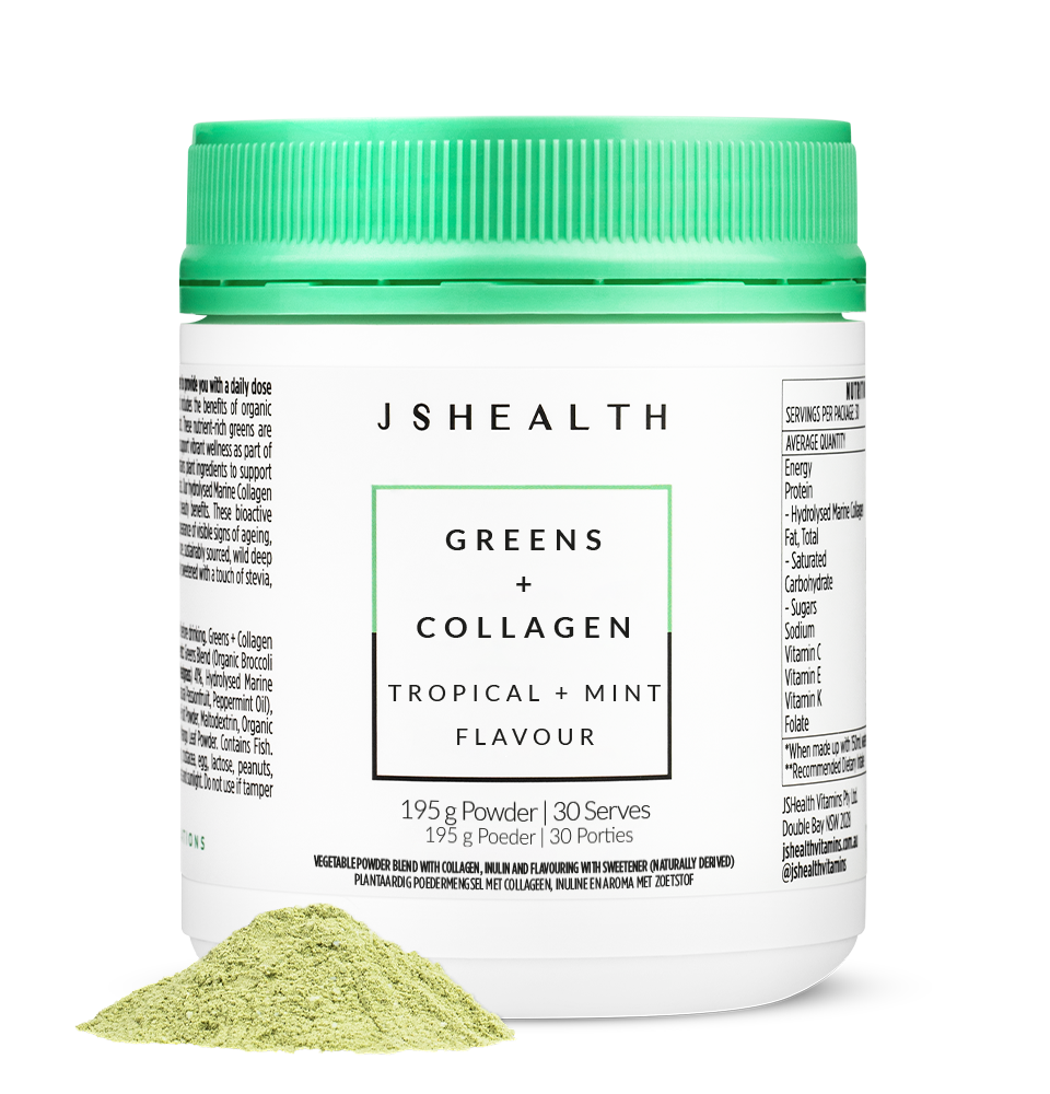 The JSHealth Greens + Collagen formula contains selected Greens ingredients with Peptan hydrolysed Marine Collagen peptides.