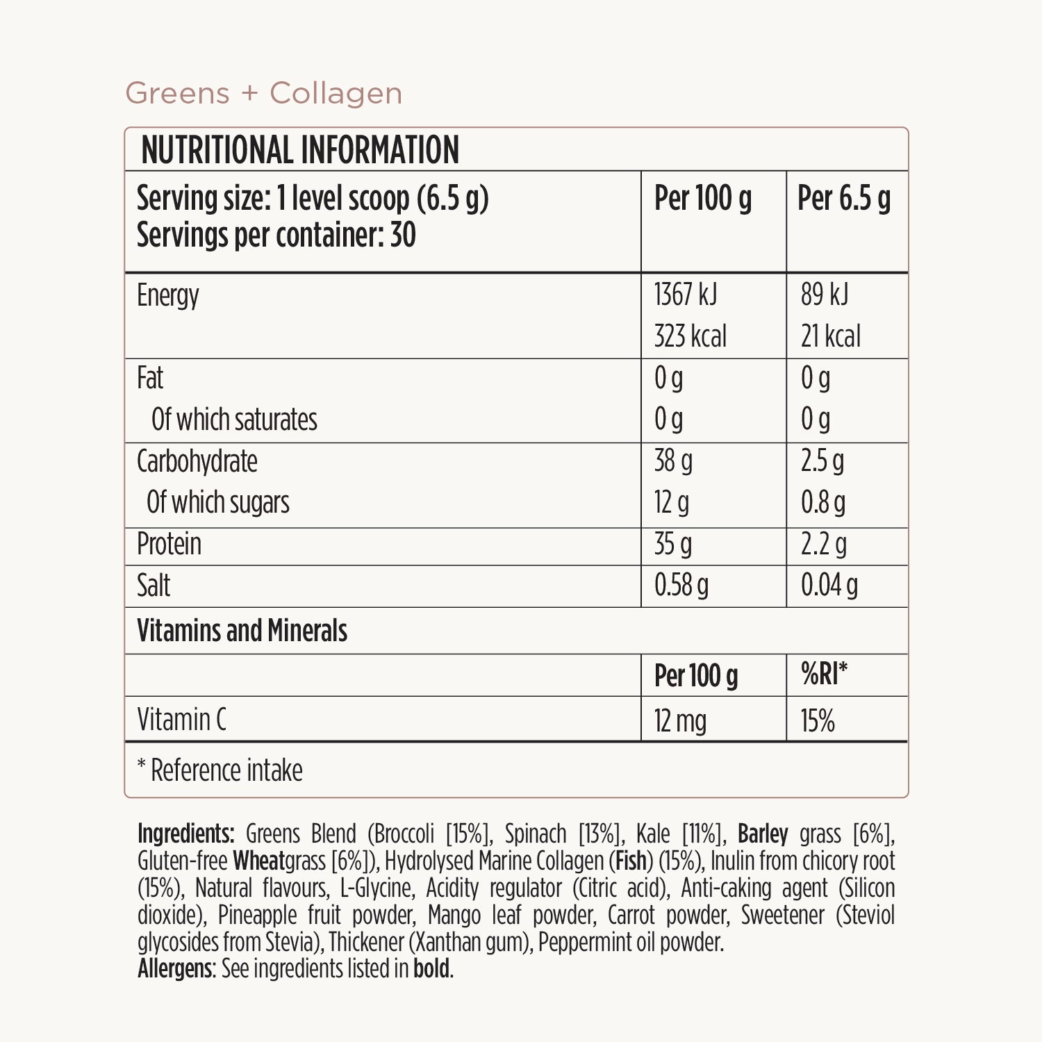 Each 6.5g serve contains the following ingredients: Greens Blend (Broccoli [15%], Spinach [13%], Kale [11%], Barley grass [6%], Gluten-free Wheatgrass [6%]), Hydrolysed Marine Collagen (Fish) (15%), Inulin from chicory root (15%), Natural flavours, L-Glycine, Acidity regulator (Citric acid), Anti-caking agent (Silicon dioxide), Pineapple fruit powder, Mango leaf powder, Carrot powder, Sweetener (Steviol glycosides from Stevia), Thickener (Xanthan gum), Peppermint oil powder.