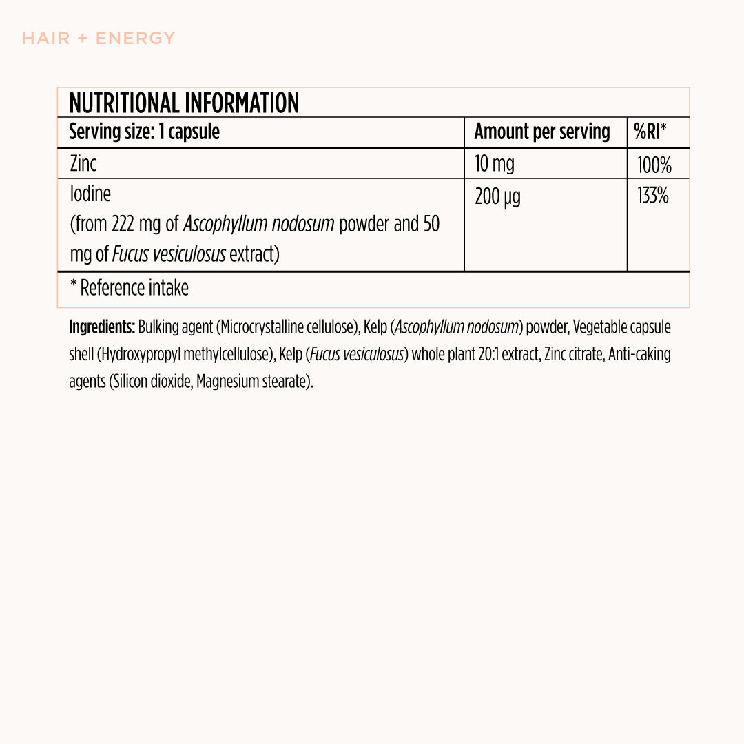 Our Hair + Energy formula contains high-quality Kelp and Zinc. Kelp is high in Iodine, which supports hair health and growth when dietary intake is inadequate, as well as supporting energy production throughout the body. Zinc helps to maintain healthy hair and contributes to the maintenance of healthy skin and nails.