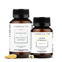 Jess' ultimate pair to support wellbeing and navigate hormones with ease. The 'Hormone Harmony' Perfect Pairing contains the Hormone + PMS and Vegan Vitamin D formulas.