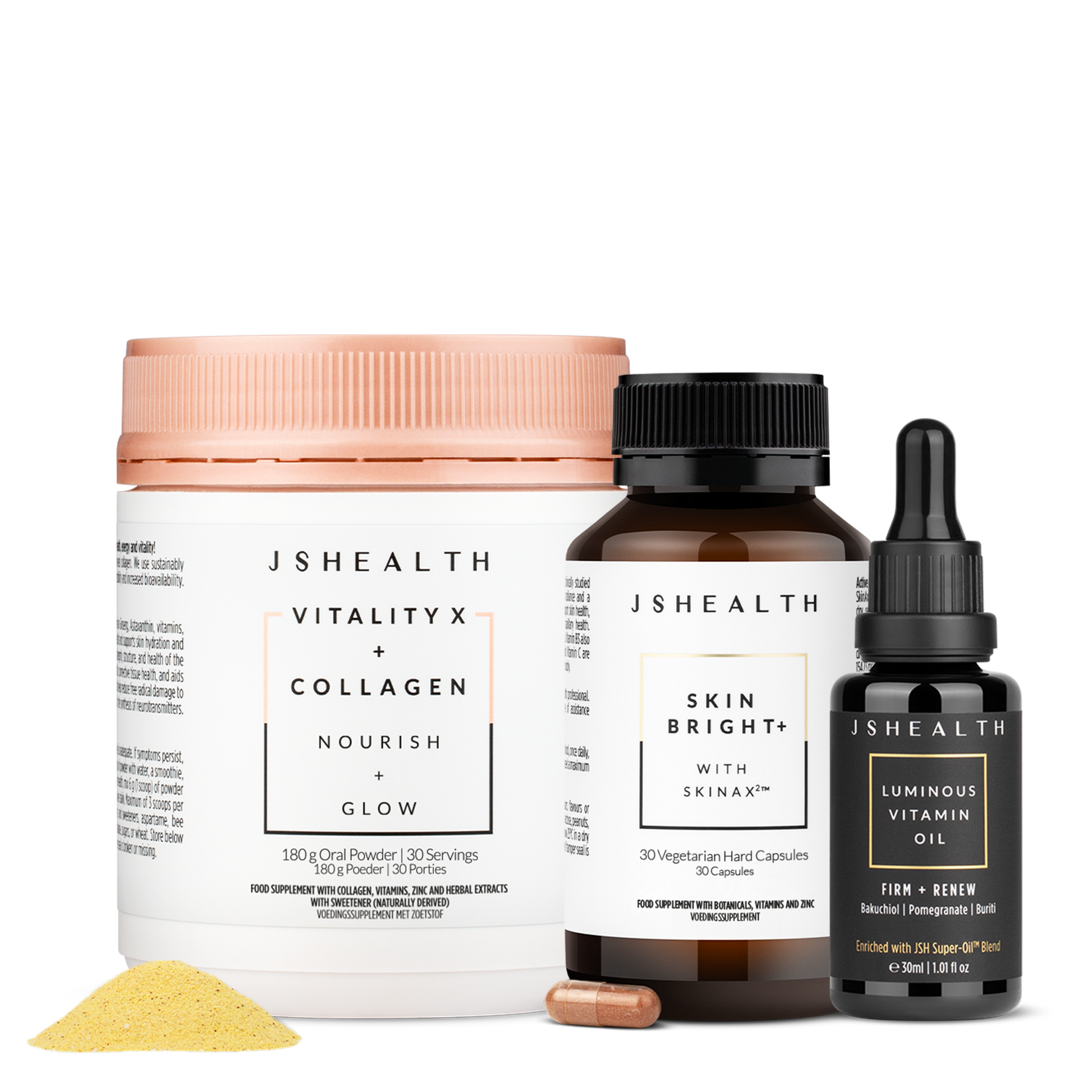 Jess' ultimate trio to support beauty from the inside out! The Inner Radiance Trusted Trio contains the Skin Bright+ formula, our signature inner beauty blend Vitality X + Collagen and our Luminous Vitamin Oil.