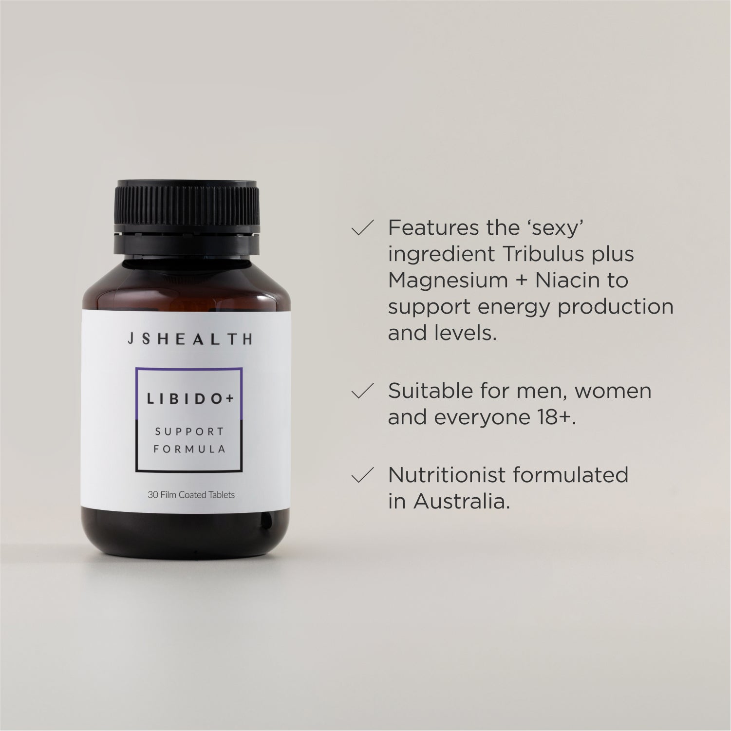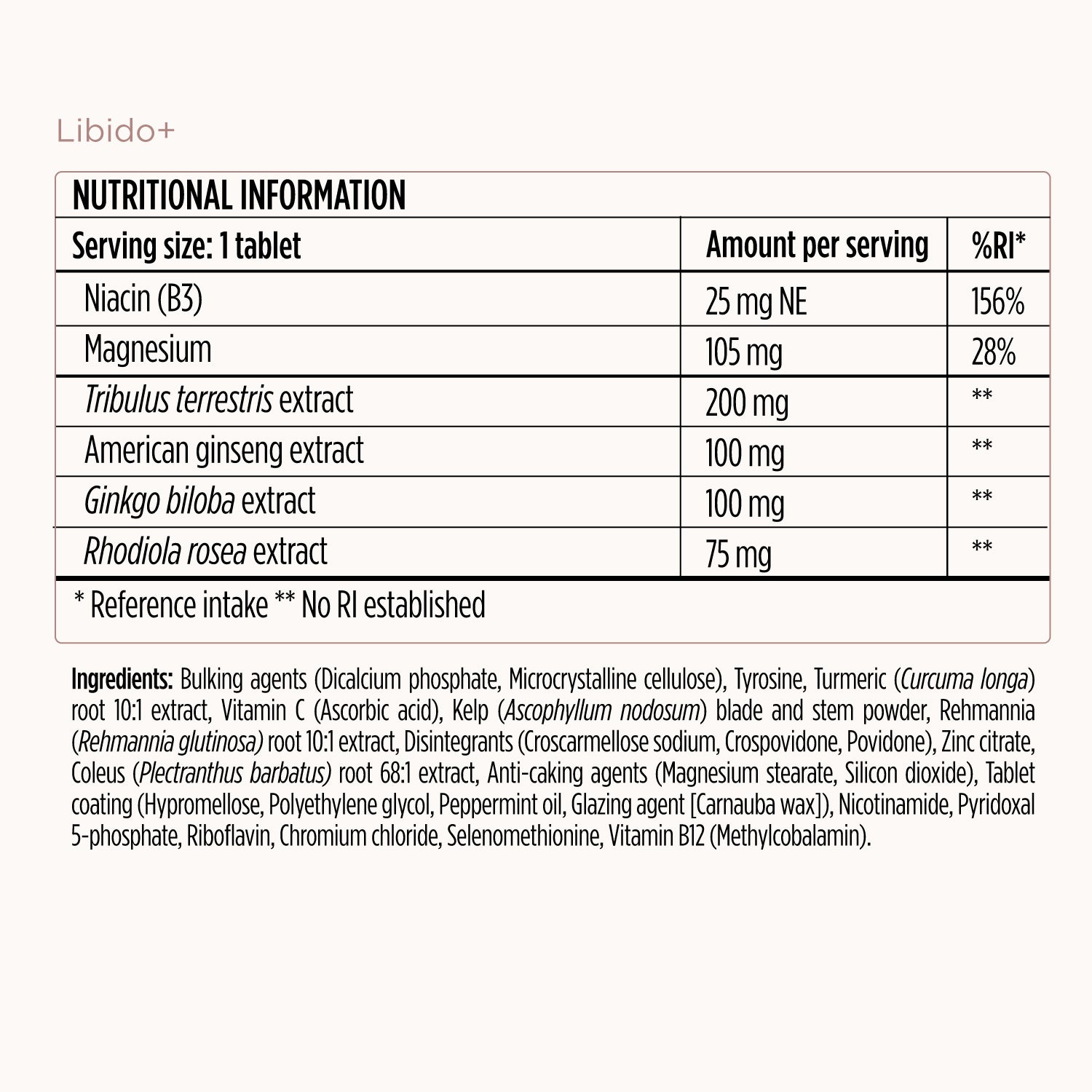 The JSHealth Libido+ formula contains Tribulus, Rhodiola, Ginkgo, Magnesium, Vitamin B3 and Ginseng.
