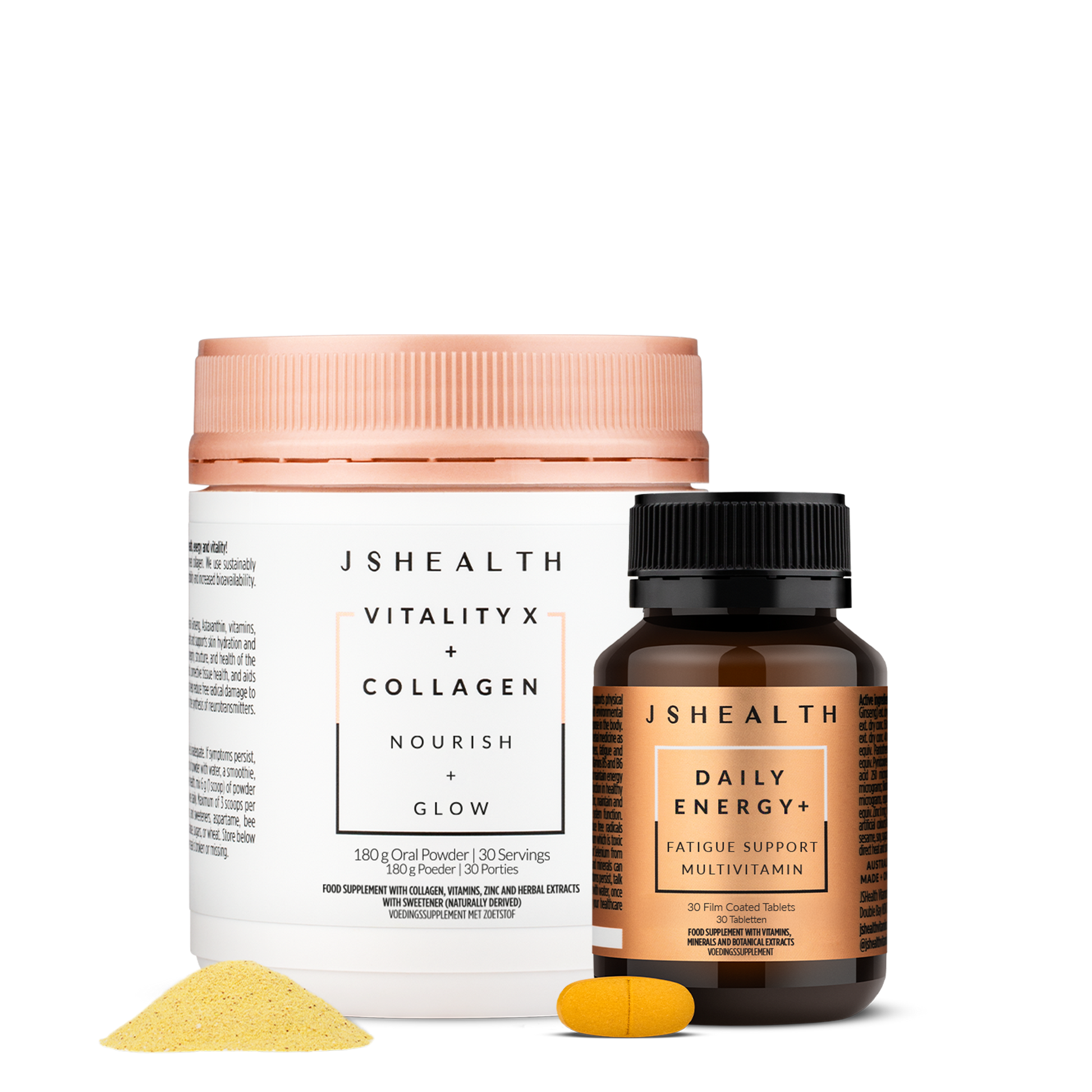 Jess' ultimate pair for an elevated morning routine. The Morning Ritual Perfect Pairing contains the Daily Energy+ formula and Vitality X + Collagen.