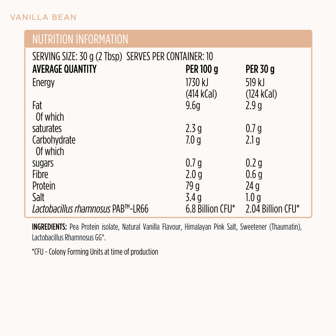 Vanilla Bean: Pea Protein isolate, Natural Vanilla Flavour, Himalayan Pink Salt, Natural Sweetener (Thaumatin*), Probiotics (Lactobacillus Rhamnosus GG).