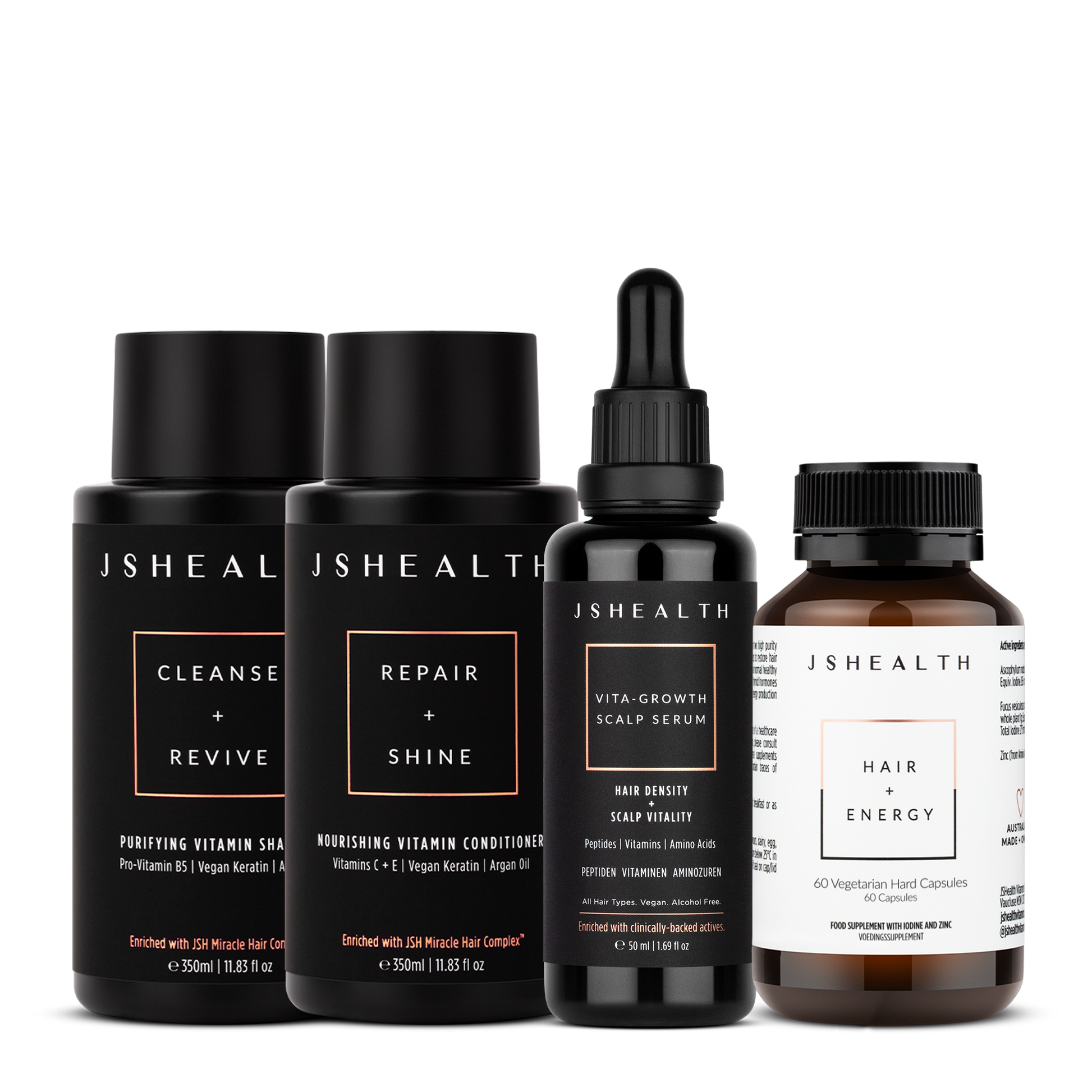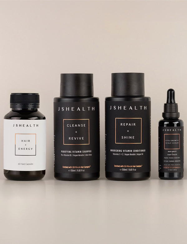 Our transformative 3-step system, created by the experts in ingestible haircare. First, take your ingestible haircare, Hair + Energy with breakfast each day. Then comes topical support. Lightly lather and moisturise your way to healthier, softer, more vibrant hair with our Purifying Vitamin Shampoo. Followed by our Nourishing Vitamin Conditioner to protect the scalp, detangle strands and add a surge of gloss-building shine. Finally, massage our Vita-Growth Scalp Serum at night (or morning and night for problem areas) for thicker, healthier hair with every drop.